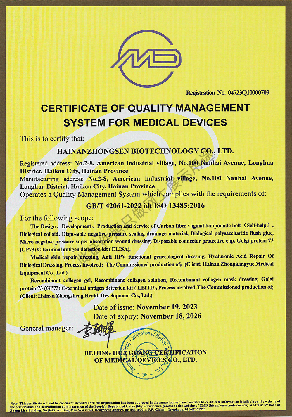 海南眾森生物科技有限公司成立于 2012年8月,位于空氣清新、環境優良的海南省海口市美國工業村園區,是一家高起點、高標準、高品質的現代化新型醫療器械生產企業,主要從事生物技術開發、醫療器械、醫用衛生材料及敷料、醫用高分子材料及制品、消毒產品等的科研、開發、生產和銷售。