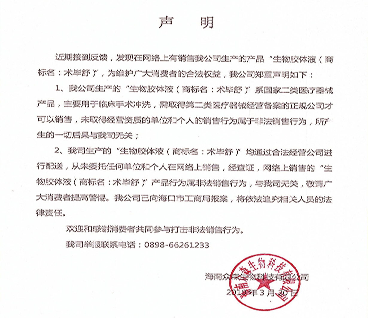 近期接到反饋,發(fā)現(xiàn)在網(wǎng)絡(luò)上有銷售我公司生產(chǎn)的產(chǎn)品“生物膠體液(商標(biāo)名:術(shù)畢舒)”,為維護(hù)廣大消費(fèi)者的合法權(quán)益,我公司鄭重聲明如下: